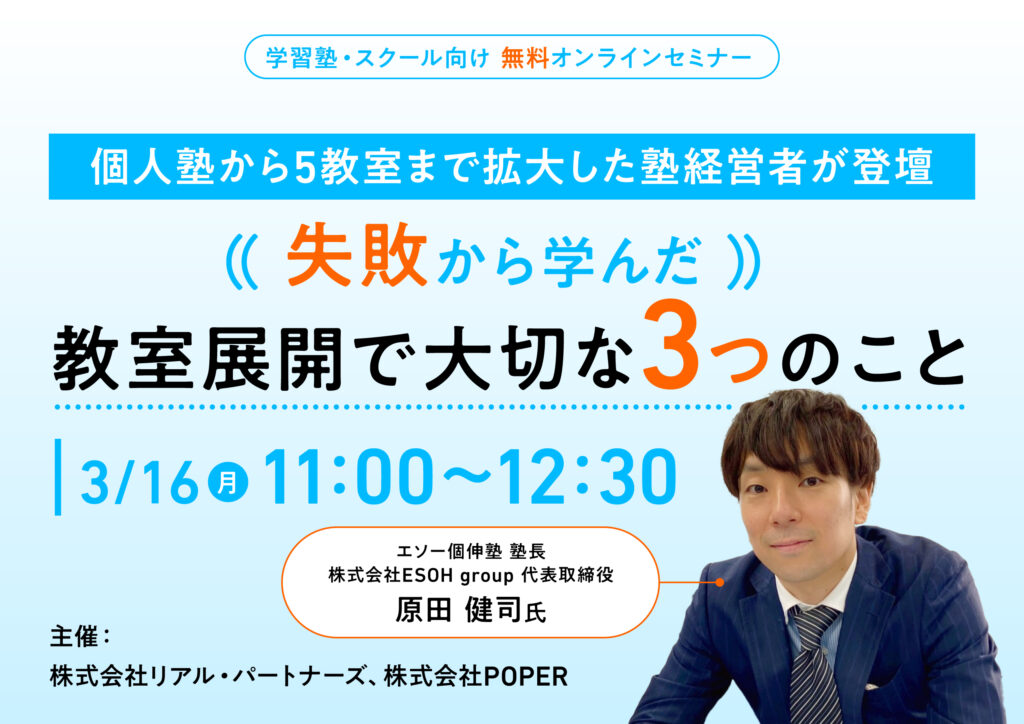 開業・独立した塾経営者であれば、誰もが一度は「2教室目を出したい」「多店舗展開したい」と考えたことがあるのではないでしょうか。 順調に生徒数が増え教室運営が安定してくると、なおさら「いよいよ2教室目を」と考えると思います。 しかし当然ながら... -